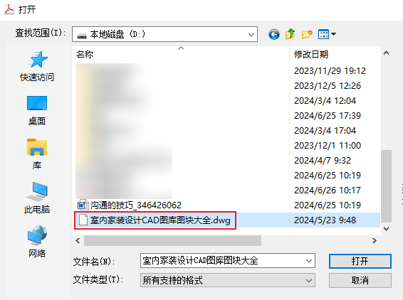 步骤三:在弹出的文件选择对话框中,找到并选择DWG文件。