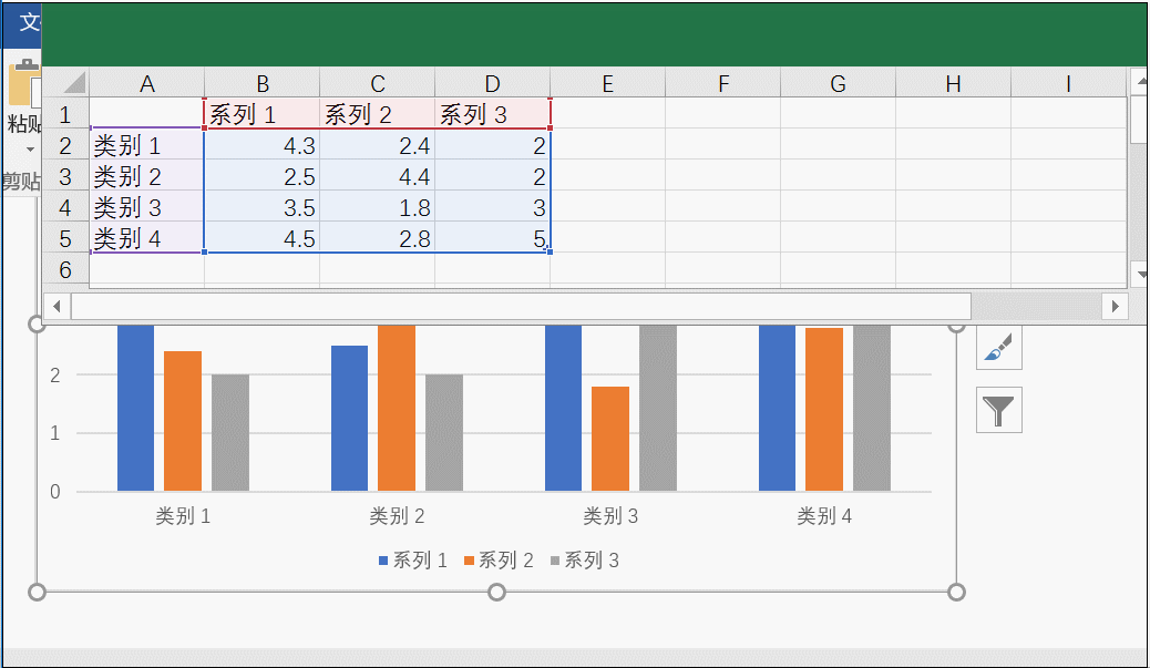 选择好图表之后,系统会自动打开Excel图表,而且里面已经录入好数据,我们只要更改一下数据即可。这里大家如果已经做好表格可以直接复制过去即可。